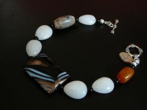 Gorgeous banded agate with teardrop-shaped white jade, onyx and jasper.