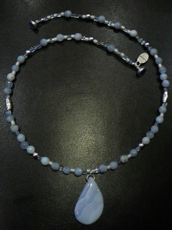 Blue lace agate – such a delicate name. And a gorgeous delicate blue colour blended with milky white. The beads are also blue lace agate, but are gently faceted. A very pretty necklace.