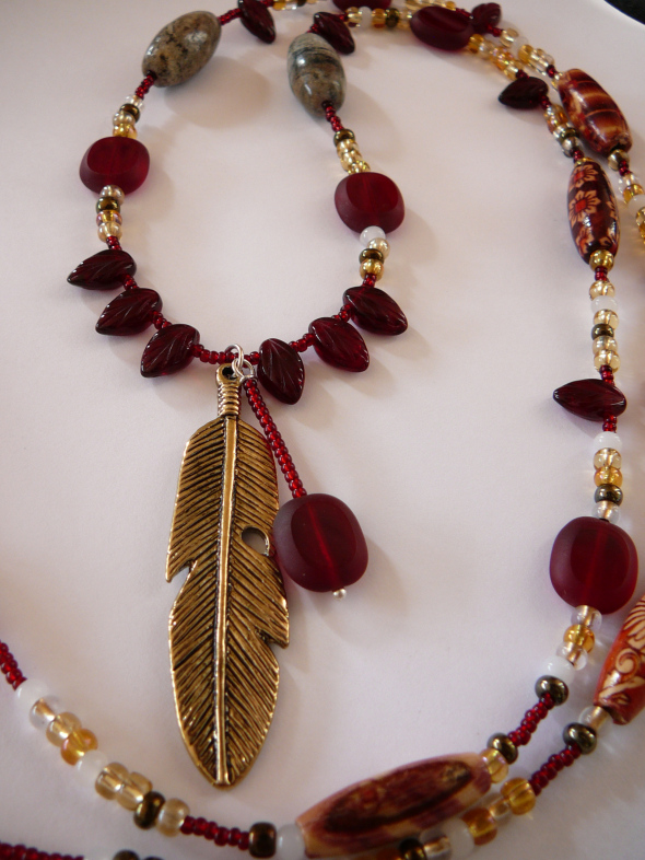 Bronze-coloured leaf and deep red glass, with barrel jasper and painted wood beads.