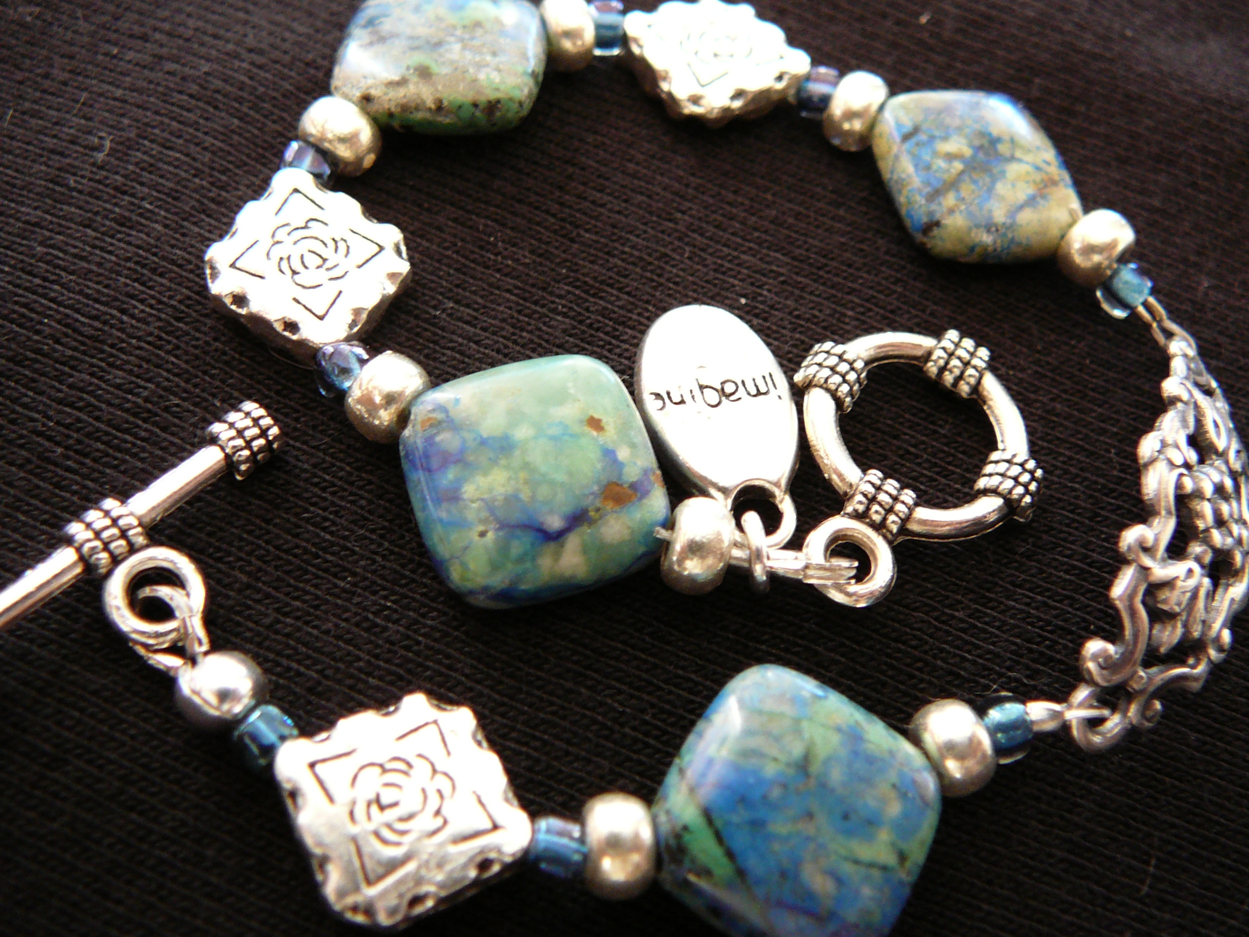 Diamond-shaped Chrysacolla beads enhanced by diamond-shaped silver colour (zinc) beads and Japanese glass seed beads.