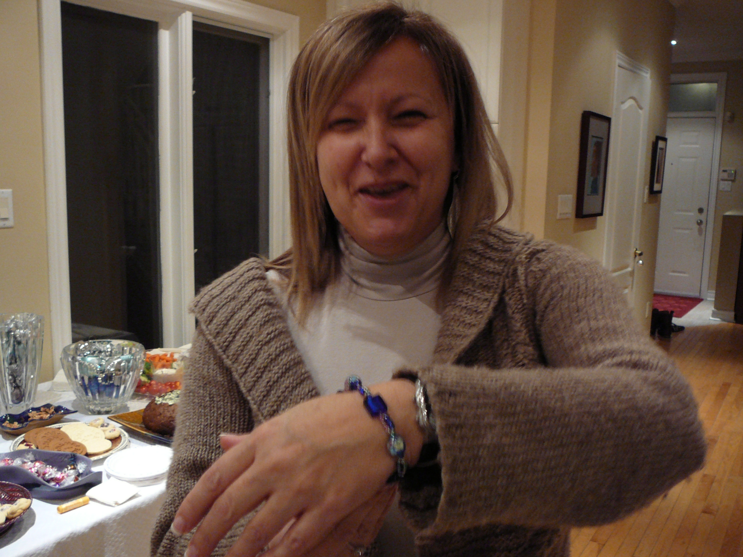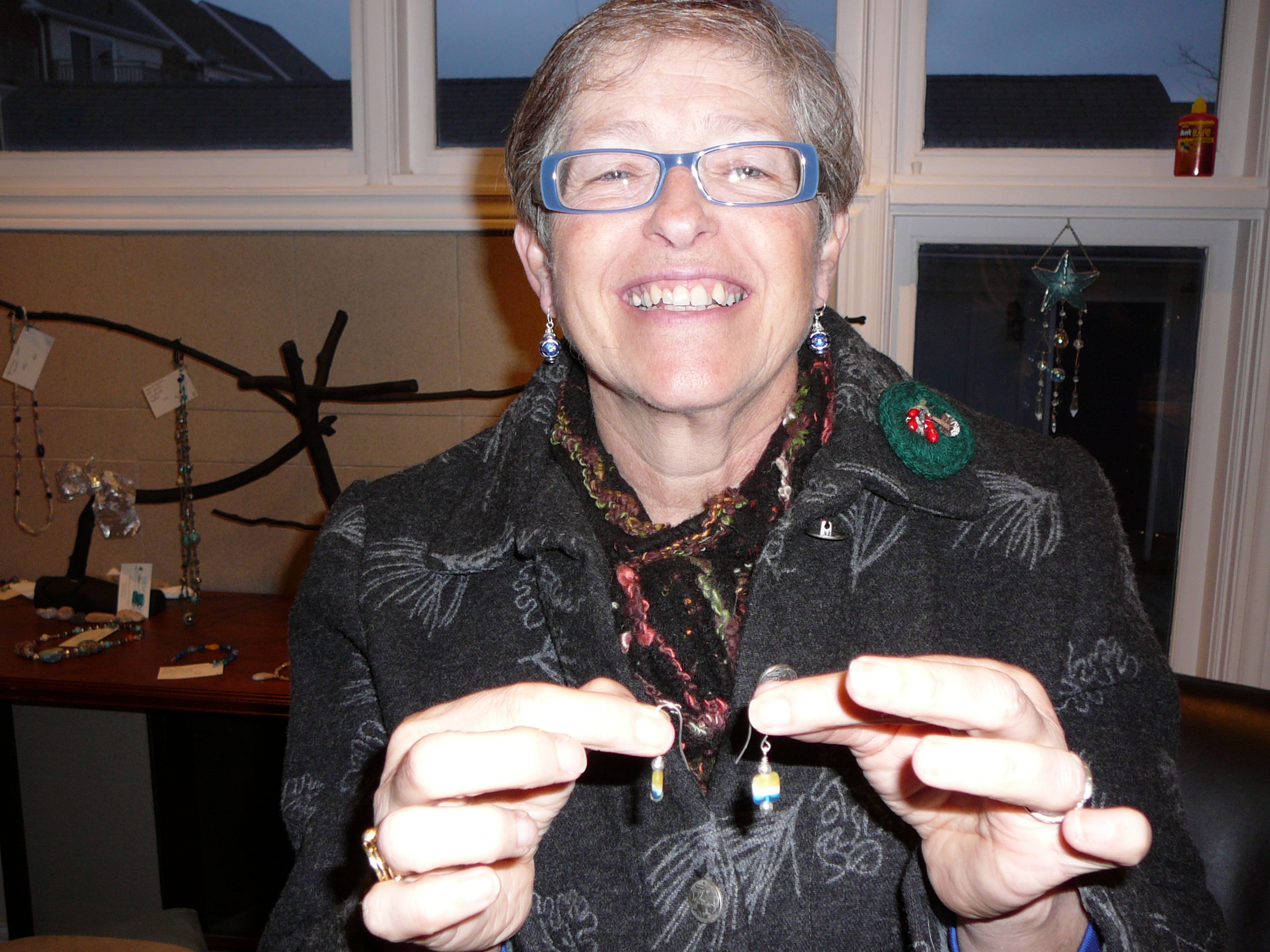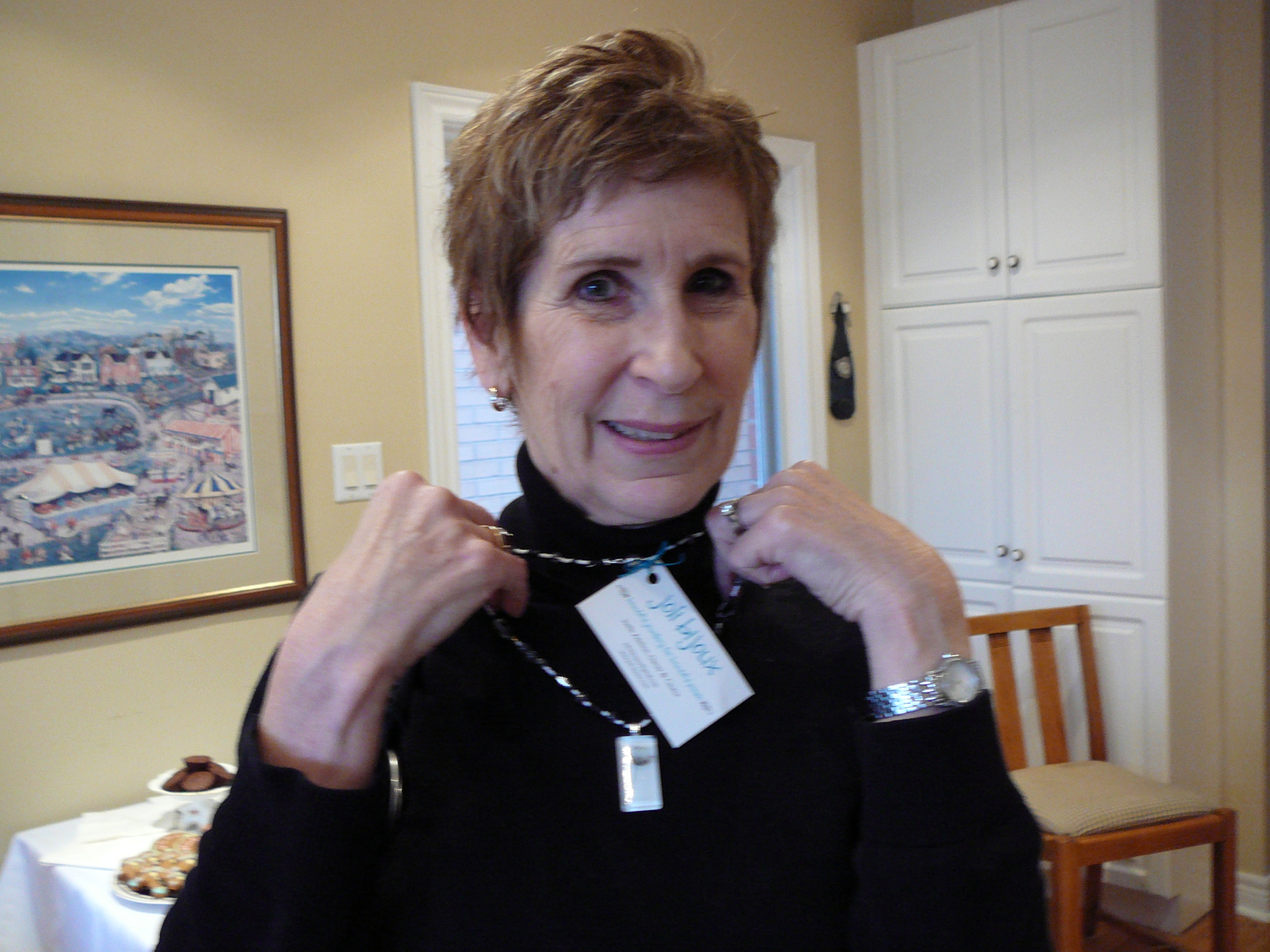 Susan with her new necklace and bracelet… and a glass of sparkling wine!