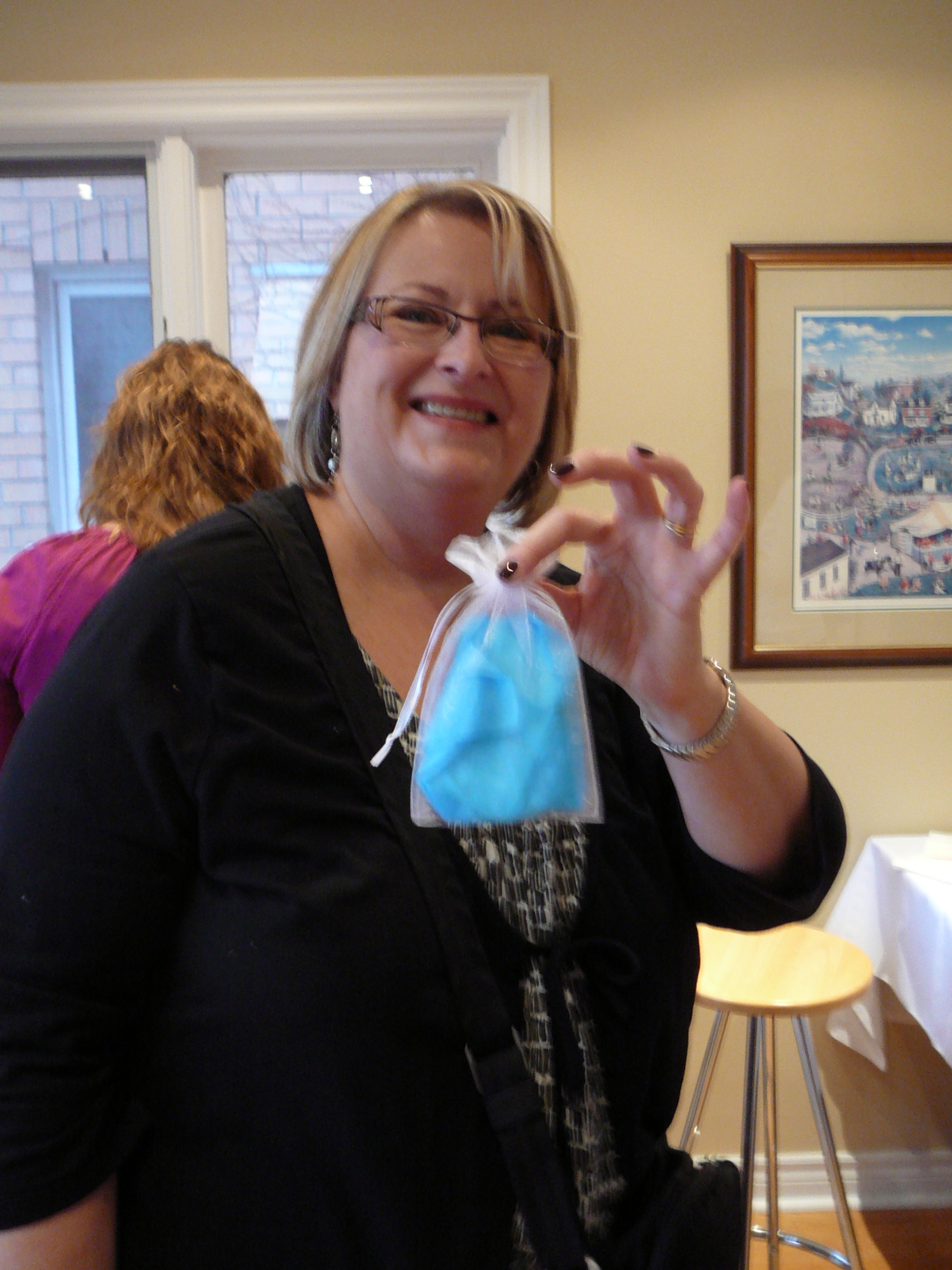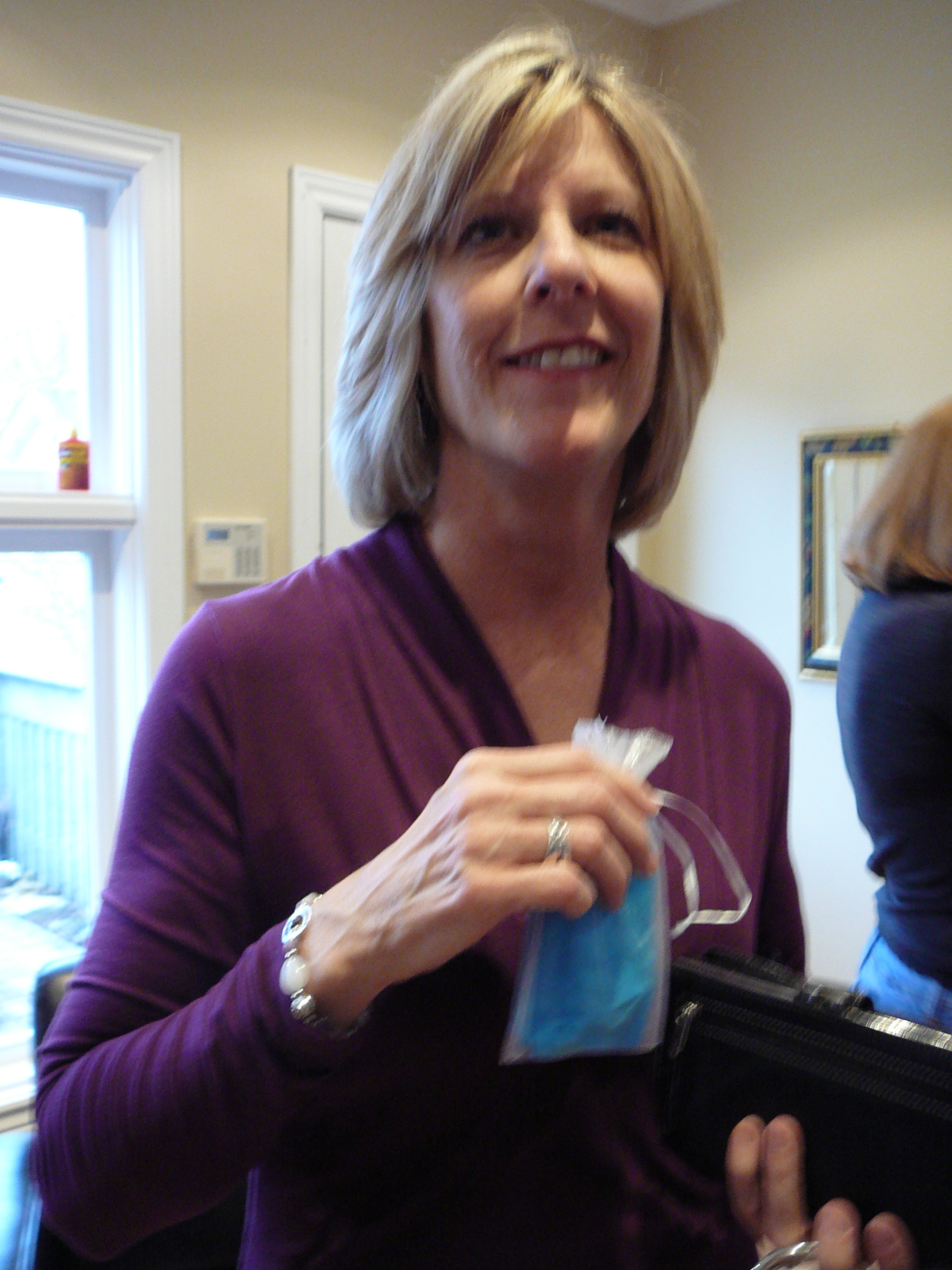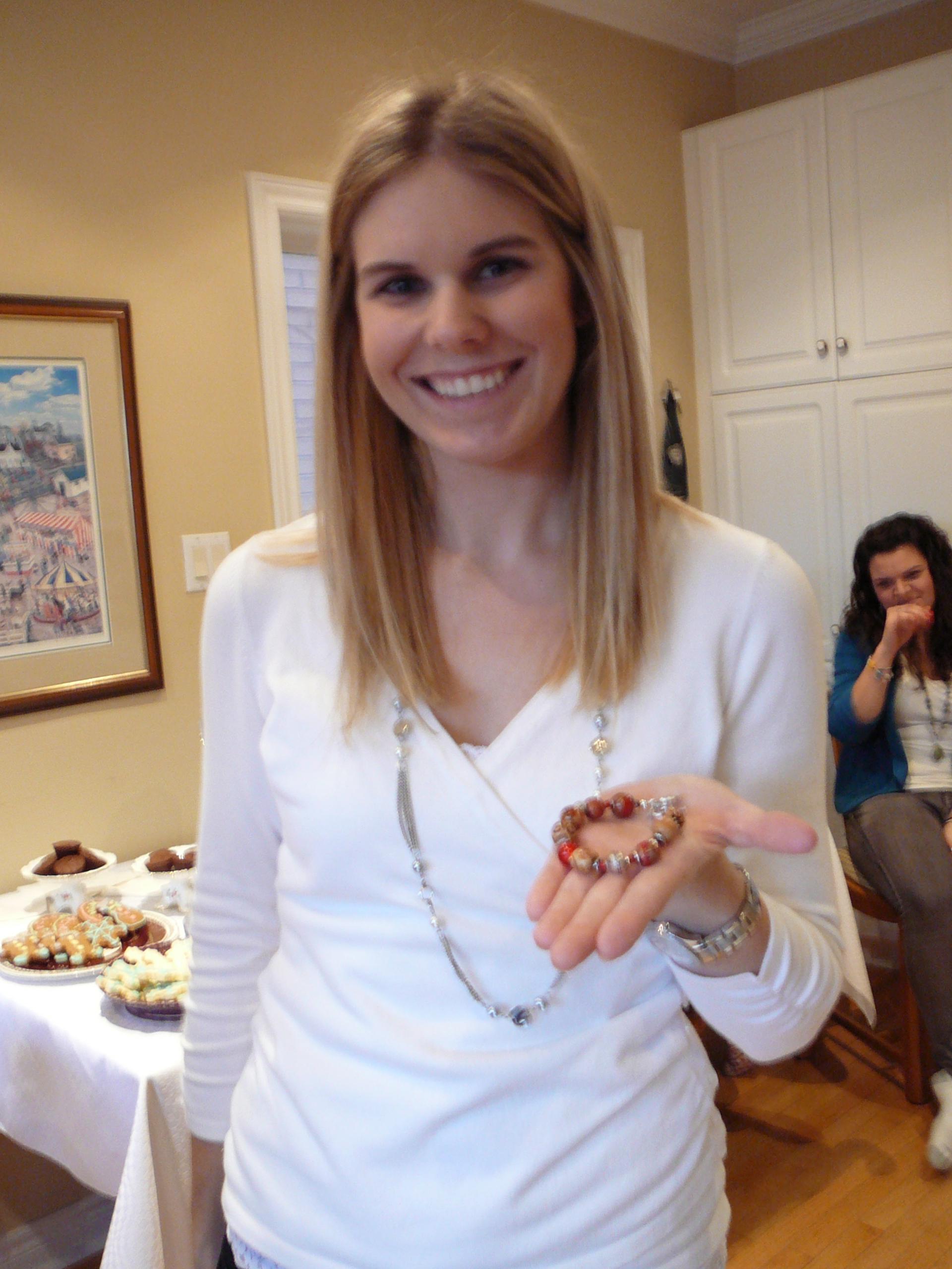 Susan with her new necklace and bracelet… and a glass of sparkling wine!