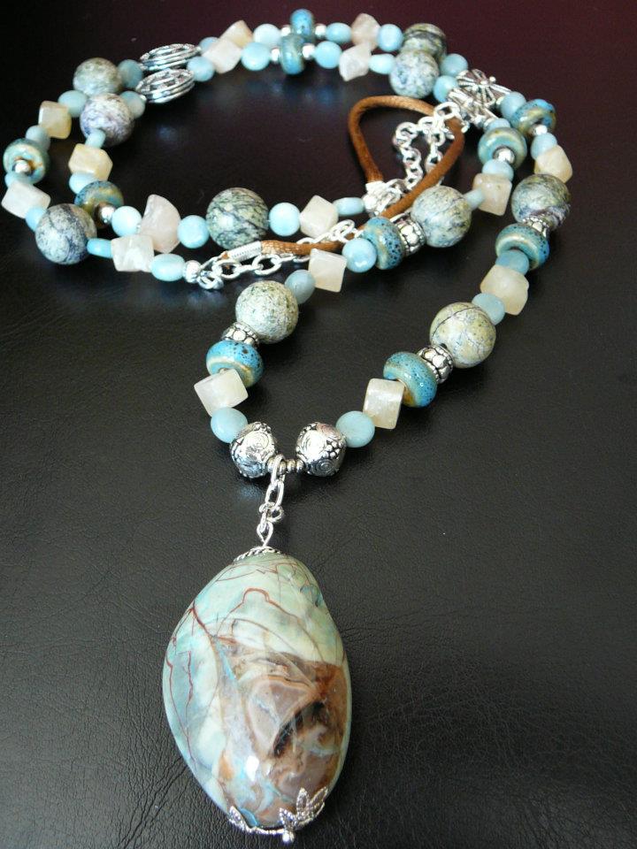 One of my daughter’s favourites – pale green chrysacolla pendant with ceramic beads, yellow aventurine, amazonite, jasper and silver.