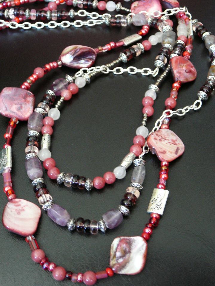 Triple strand with amethyst shell, pink jade, rose quartz, amethyst, silver.