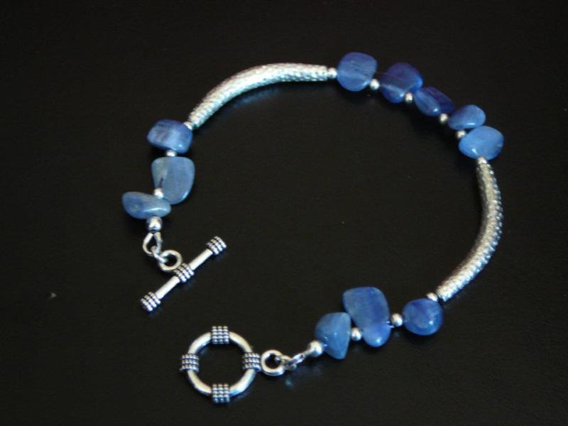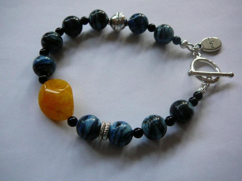 Deep blue (and black) net jasper beads separated by small onyx beads, and a wonderful surprise of one piece of bright yellow candy jade. And it feels so good on…