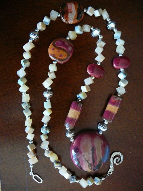 I love this necklace! A beautiful slice of blue agate which I have complemented on the strand with lapis lazuli, botswana agate (the barrel-shaped white stones), jasper, chrysocolla (a beautiful…